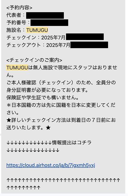 ホテルを予約したらすぐに、ホテルからメッセージが来ました。そのメッセージにはリンクがついていて、そこにパスポート情報を全員分入れ込みました。
