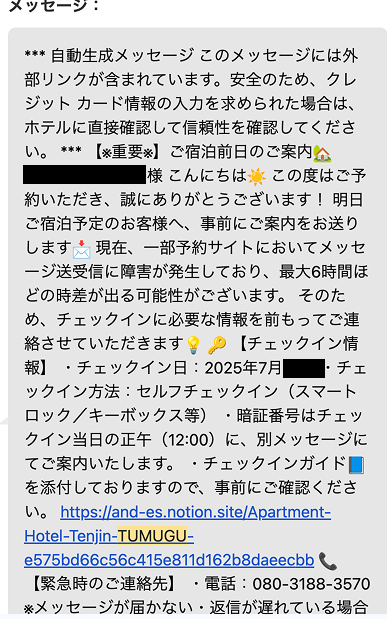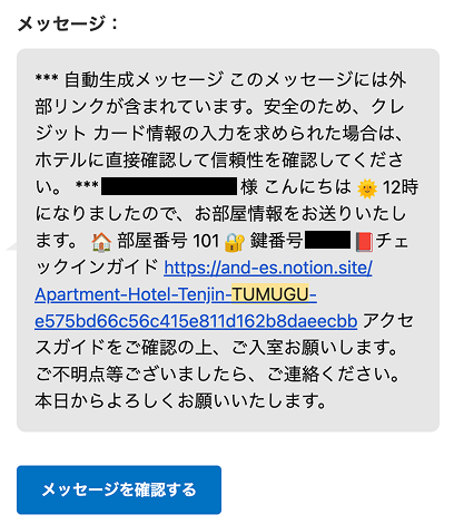 当日の12時に来た、お部屋の暗証番号が書いたメッセージ